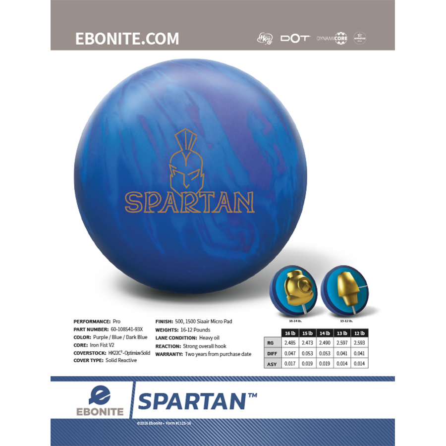 The Spartan charges into the Ebonite lineup as a fighter, built for heavy oil. This one demands volume, and rewards you with incredible continuation and backend motion rarely seen in a ball with this much traction. The Spartan’s core shape is inspired by the proven Iron Fist design from the Warrior series, now paired with the most advanced cover in the game: HK22C² with Optimize Solid additives. The combination of aggressive core numbers and this game-changing cover creates an oil-fighting warrior that looks unstoppable from start to finish.