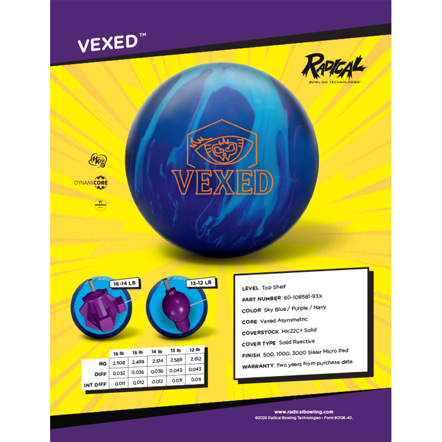 The drilling instructions for the Vexed are based on the same concept as the Evel Eye, taking into account where the thumb hole is placed. Both balls use drilling into the core protrusion to dictate performance; the difference being that the Vexed core allows for more motion down lane, making it the perfect complement to the Evil Eye. When our testers compared Vexed to the Evil Eye, they found an increase in overall hook and a sharper backend motion due to the stronger core and upgraded HK22C+ cover. They all agreed that the Vexed and the Evil Eye are a perfect one-two punch. To assist our customers, we have kept the drilling categories very similar, offering four asymmetrical drillings and two symmetrical drillings. We believe sales of the Vexed will rival those of the Evil Eye.