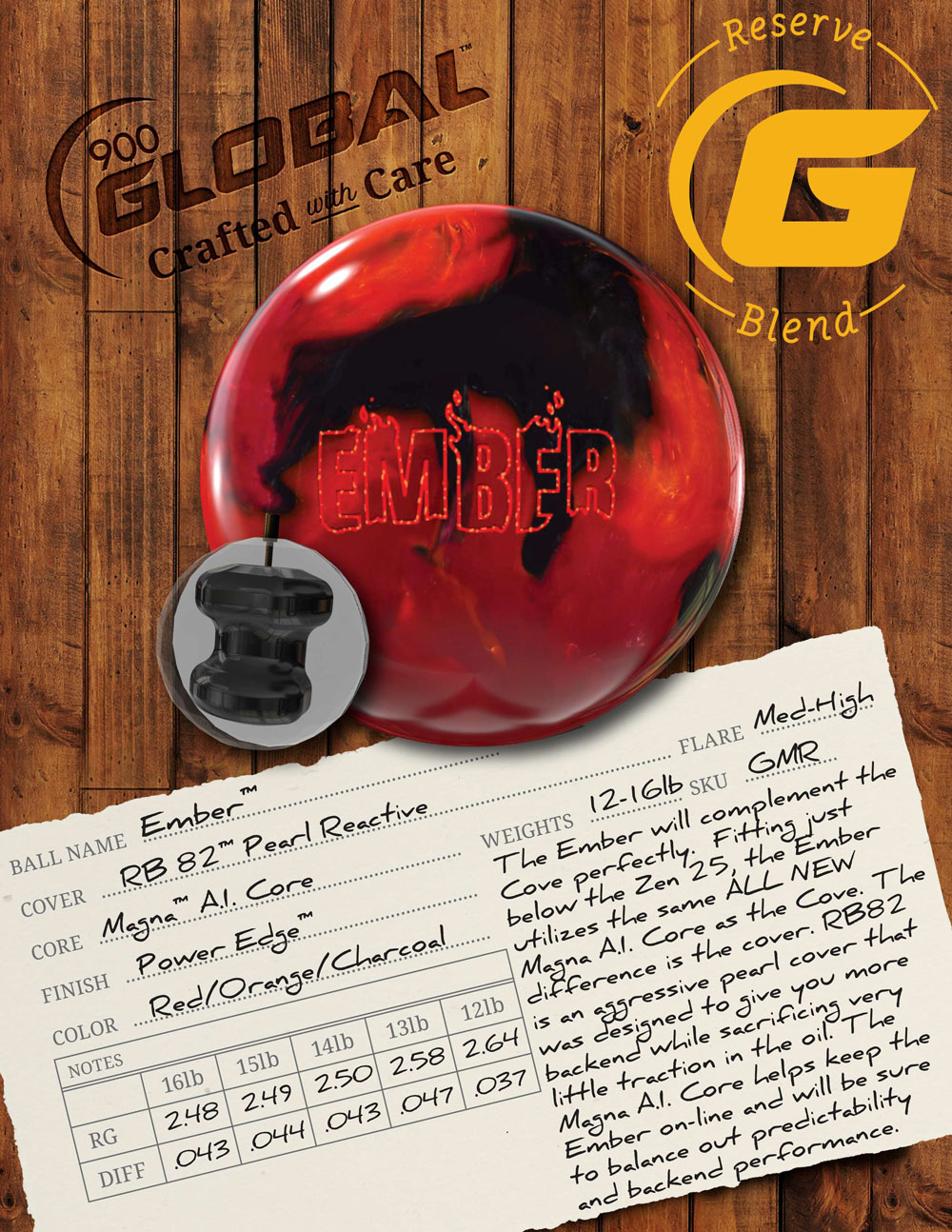 The Ember joins the 800 Series and is designed to complement the Cove to handle medium conditions. The Ember utilizes the same all-new Magna A.I. Core as the Cove but differs in the choice of the cover. The RB 82 Pearl Reactive Coverstock was chosen as a more aggressive cover designed to give you stronger backend motion when you need it.