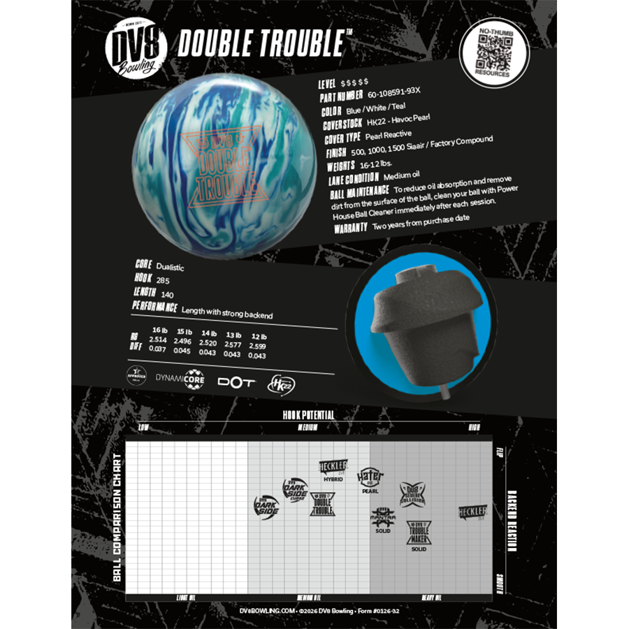 Double Trouble reinforces DV8’s commitment to no-thumb bowlers—proof that our leadership in the category isn’t a moment in time, but an ongoing pursuit of better motion, smarter design, and performance that keeps the fastest growing segment of bowlers ahead of the curve.