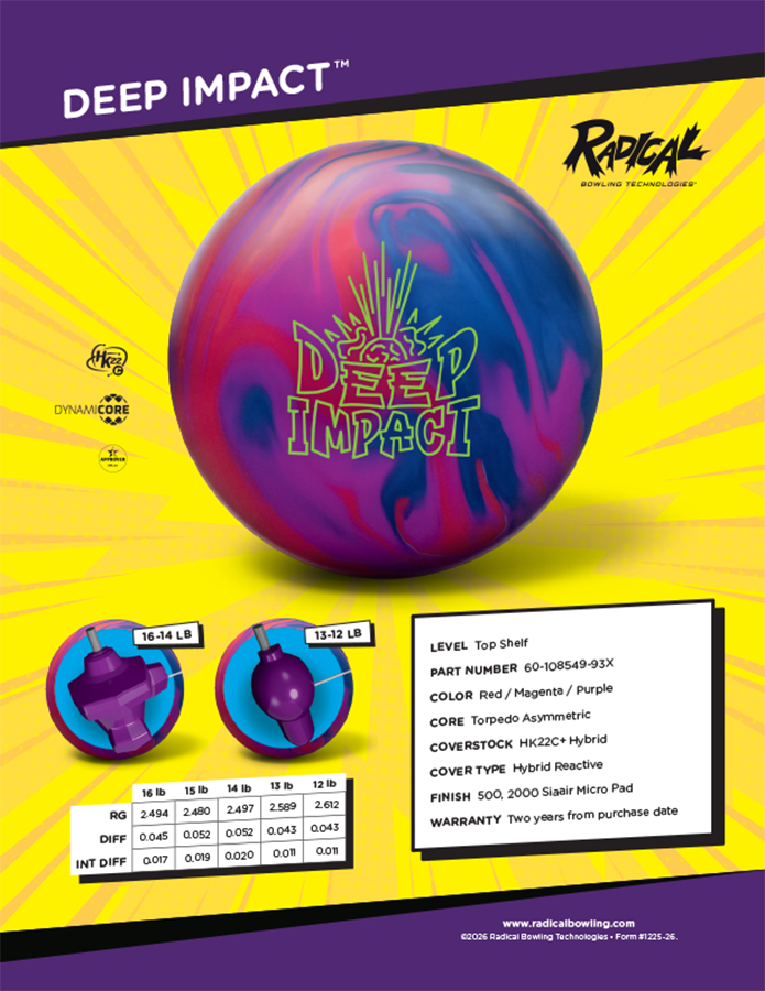 Radical is very excited to announce a new addition to the Top Shelf line, The Deep Impact. The Deep Impact core design features very dynamic after-drilling numbers, which have proven very helpful for locking in your performance. In addition to strong core dynamics, we have wrapped it in our HK22C+ Hybrid cover, which gives it a strong mid-lane move and strong recovery. The Deep Impact has an RG of 2.48, a total differential of .054, and an intermediate differential of .018. It features a 3 to 1 differential ratio between the intermediate and total differential, which we have found yields the best continuation numbers.  Our testers all reported a strong mid-lane move and lots of continuation, all of which is attributed to the addition of the HK-22C+ Hybrid cover package. We have a strong asymmetrical ball that reads the mid-lane yet still maintains rotation, so it is very continuous.With our new ball launches, we are featuring drilling instructions that offer a wide variety of ball motion, with “no balance hole” options so that bowlers can make a smoother transition to the new ball specifications.  Again, this is just another example of why Radical is quickly becoming a leader in bowling ball technology.  We call it the #Radical Revolution.At Radical Bowling Technologies, innovation is our commitment.  We deliver high-tech, high-quality products for the betterment of the game …Wow!  That’s Radical!