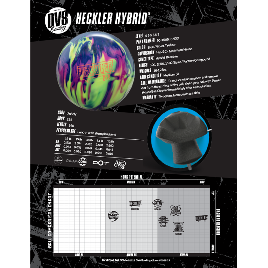 Chez DV8, nous croyons que deux mains valent mieux qu’une, et la Heckler l’a prouvé en devenant une arme de choix pour les joueurs à deux mains qui recherchent un asymétrique contrôlé pour affronter les conditions d’huile plus lourdes. Voici maintenant la Heckler Hybrid, conçue pour maintenir la performance lorsque l’originale devient trop agressive. Dotée du même noyau Unholy, spécialement conçu pour les joueurs à deux mains, et recouverte de la nouvelle surface HK22C – Maximum Havoc Hybrid, cette version offre plus de longueur et une réaction plus fluide sur les conditions moyennes. Pensée avant tout pour les joueurs à deux mains, mais suffisamment puissante et polyvalente pour convenir à tous les styles, la Heckler Hybrid ne fait pas de distinction : peu importe la façon dont vous lancez, elle fera voler les quilles.