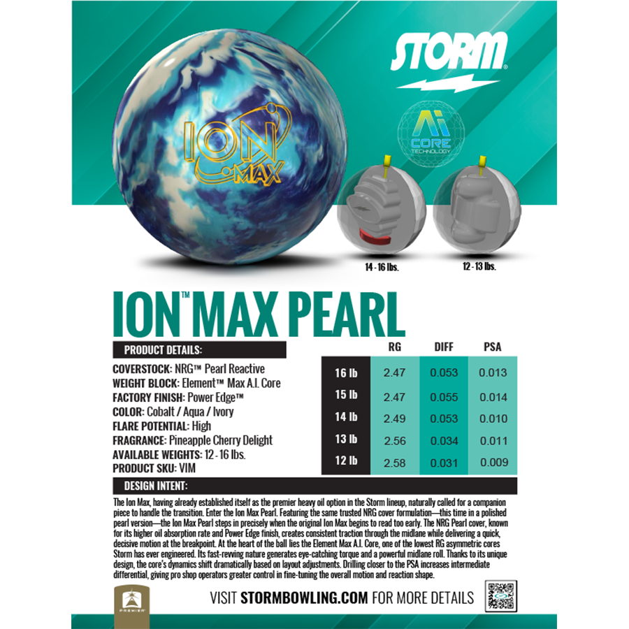 La Ion Max, déjà établie comme la référence pour les conditions très huilées dans la gamme Storm, nécessitait naturellement une boule complémentaire pour gérer la transition. Voici la Ion Max Pearl. Dotée de la même formulation de revêtement NRG éprouvée, cette fois-ci en version Pearl polie, la Ion Max Pearl entre en jeu exactement au moment où la Ion Max originale commence à lire trop tôt dans l’allée. Le revêtement NRG Pearl, reconnu pour son taux d’absorption d’huile plus élevé et sa finition Power Edge, crée une traction constante au milieu de l’allée, tout en offrant un mouvement rapide et décisif au point de rupture. Au cœur de la boule se trouve le noyau Element Max A.I., l’un des noyaux asymétriques à RG le plus bas jamais conçus par Storm. Sa montée en régime rapide génère un couple impressionnant et un roulement puissant au milieu de l’allée. Grâce à son design unique, les dynamiques du noyau varient fortement selon le layout. Un perçage plus près du PSA augmente le différentiel intermédiaire, donnant aux pro shops un contrôle accru pour ajuster avec précision la réaction globale et la forme de trajectoire.