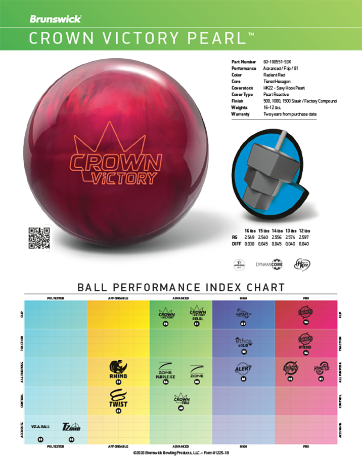 La nouvelle Brunswick Crown Victory Pearl définit parfaitement la performance skid-flip. En combinant le cœur éprouvé Tiered Hexagon avec un revêtement HK22 Pearl enrichi des additifs Savvy Hook Pearl, Brunswick a réglé cette boule pour offrir encore plus de longueur et un backend plus vif et agressif. La Crown Victory Pearl reprend tout ce que les quilleurs ont adoré de la version originale, en plus propre et plus réactif lorsqu’elle rencontre la friction. Elle excelle lorsque vous pouvez ouvrir vos angles et la laisser travailler, produisant une trajectoire dynamique et génératrice de pointage, impossible à ignorer. Pour les quilleurs qui recherchent un gros flip et de gros résultats, la Crown Victory Pearl est la boule idéale quand vient le moment de frapper fort… et souvent.